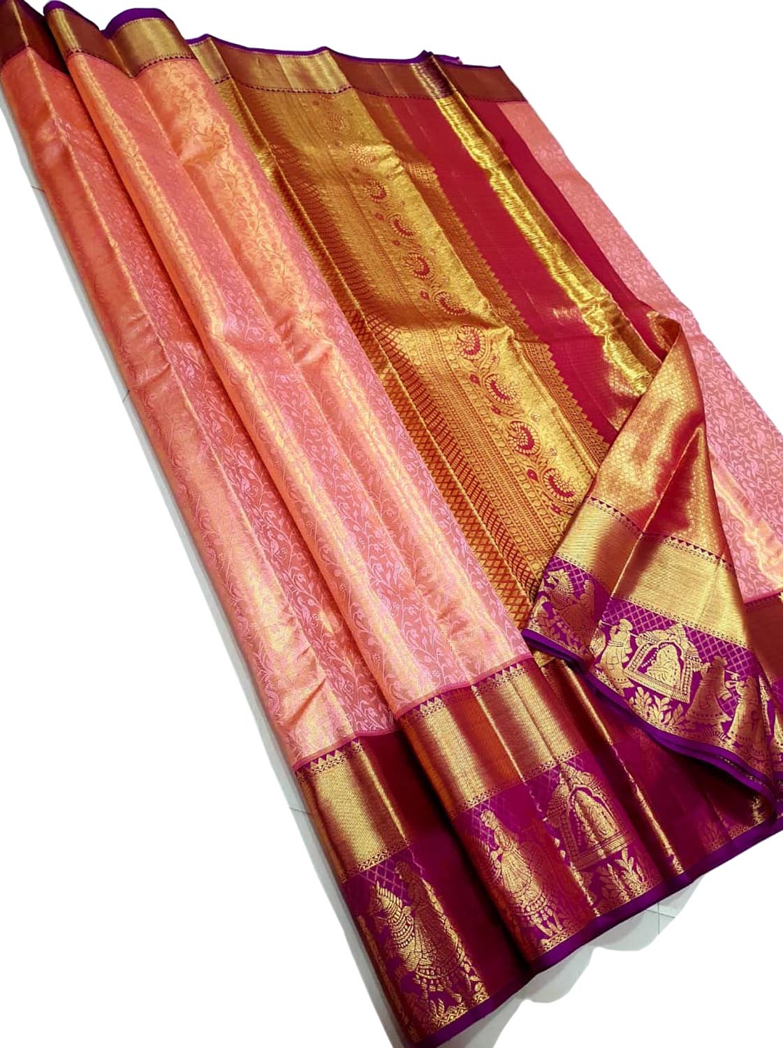 Experience the pinnacle of South Indian textile artistry with this Pink Pure Kanjivaram Tissue Silk Handloom Saree, adorned with graceful elephant motifs. Woven from luxurious tissue silk using traditional handloom techniques, this six-yard saree features an elegant contrast border that frames the fabric beautifully. The intricate elephant designs symbolize prosperity and grace, adding cultural significance to your wardrobe. Ideal for weddings, festivals, and formal celebrations, this saree represents generations of weaving expertise and refined craftsmanship. A timeless investment piece that honors heritage while elevating your personal style.