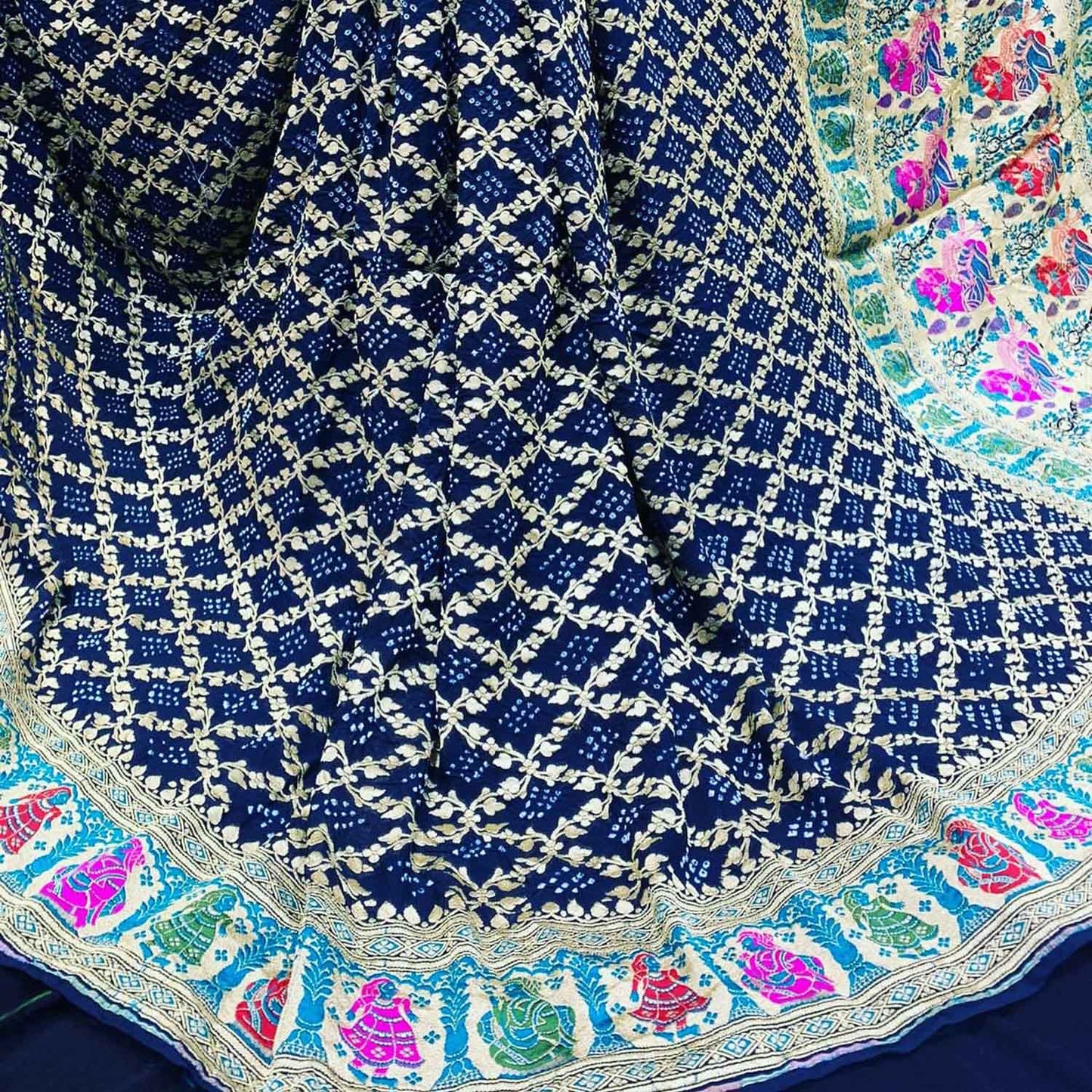 This is a Bandhani Georgette Saree - an ideal party wear. The art of Bandhani is a highly skilled process. The technique involves dyeing a fabric, which is tied tightly with a thread at several points, thus producing variety of patterns like Leheriya, Mothra, Ekdali and Shikari depending on the manner in which the cloth is tied. Bandhani work, after the processing is over, results into a variety of symbols including, dots, squares, waves and strips. A meter length of cloth can have thousands of tiny knots .These knots form a design once opened after dyeing in bright colors.