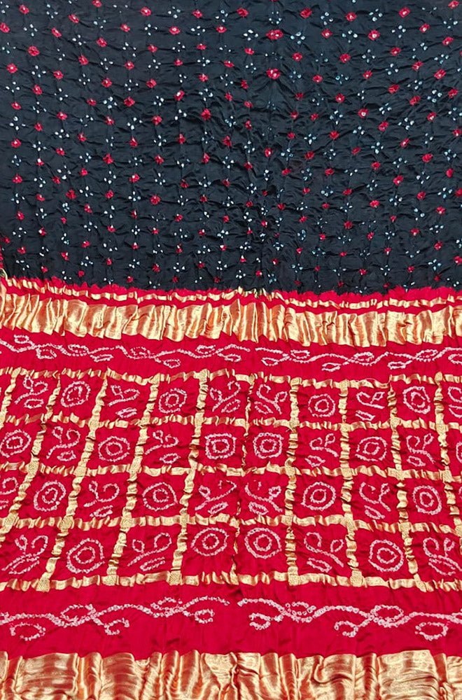The Black And Red Checks Bandhani Gajji Silk Gharchola Saree is a stunning piece of traditional Indian clothing that is perfect for any special occasion. Made from high-quality gajji silk, this saree features a beautiful black and red checkered pattern that is accented with intricate bandhani work. The gharchola style of the saree is characterized by its large pallu that is adorned with intricate embroidery and tassels, making it a truly unique and eye-catching piece.