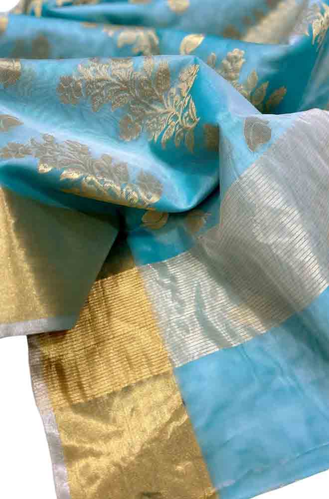 "Chanderi sarees take its name from the place of Chanderi in Madhya Pradesh where it is produced. Amongst the best-known handloom clusters, it occupies a special place because of century’s old weaving speciality.The most unique feature of this texture is its transparency which imparts an unmatched sophistication and confront to it. In recent times, it has been patronized by eminent designers and this is used generously in designing sarees. At Luxurion World we take pride in delivering the best.