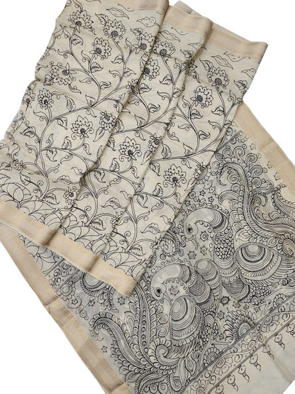 The Black And White Hand Painted Kalamkari Bangalore Silk Saree is a stunning piece of traditional Indian attire that is perfect for any formal occasion. This saree is made from high-quality Bangalore silk and features intricate hand-painted Kalamkari designs in black and white. The saree is lightweight and easy to drape, making it comfortable to wear for long periods of time.