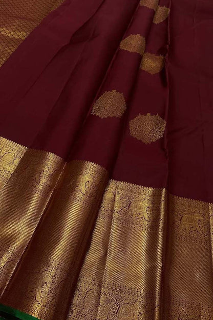 The Maroon Handloom Kanjeevaram Pure Silk Saree is a timeless and elegant piece of traditional Indian attire. Handcrafted with intricate weaving techniques, this saree exudes luxury and sophistication. The rich maroon color adds a touch of regality, making it perfect for special occasions and festivities. The pure silk fabric drapes beautifully, enhancing the wearer's silhouette and adding a touch of glamour. The saree features traditional Kanjeevaram motifs and patterns, adding to its charm and allure. Its versatility allows it to be styled in various ways, making it a versatile addition to any wardrobe. Stand out in a crowd with this exquisite Maroon Handloom Kanjeevaram Pure Silk Saree.