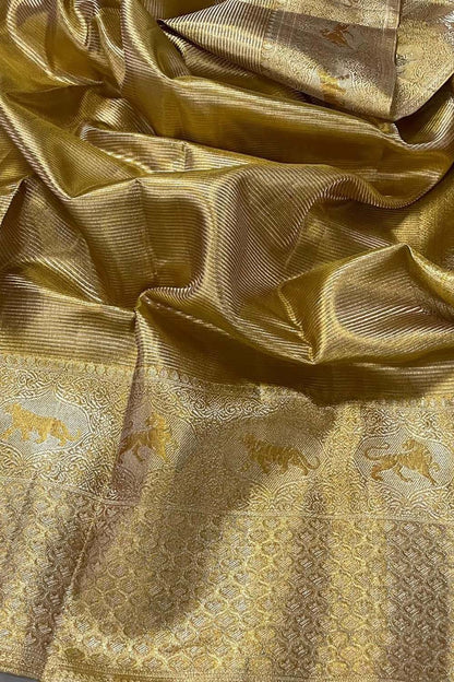 The Golden Kanjeevaram Pure Tissue Silk Animal Design Saree is a stunning piece of traditional Indian attire that exudes elegance and sophistication. Made from luxurious tissue silk, this saree features intricate animal designs woven into the fabric, adding a unique and eye-catching touch. The golden color of the saree adds a touch of glamour and richness, making it perfect for special occasions and events. The soft and lightweight fabric drapes beautifully, enhancing the wearer's silhouette and creating a flattering look. This saree is a timeless piece that will never go out of style and is sure to turn heads wherever you go.