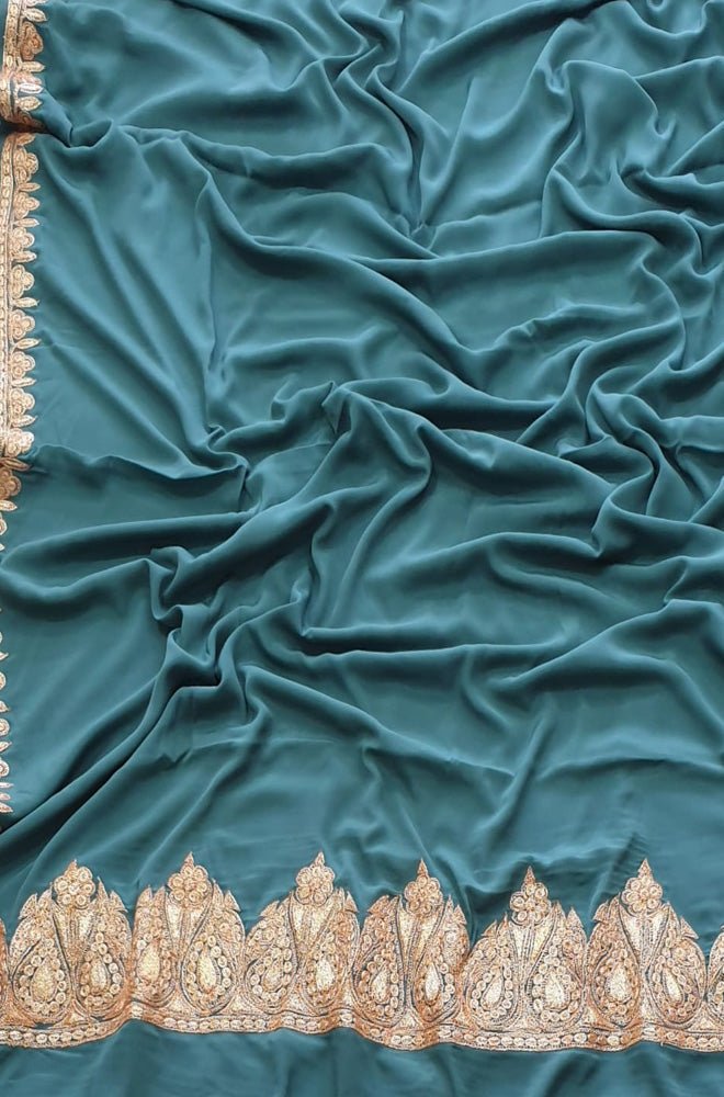 Blue Plain Embroidered Kashmiri Tila Work Crepe Saree