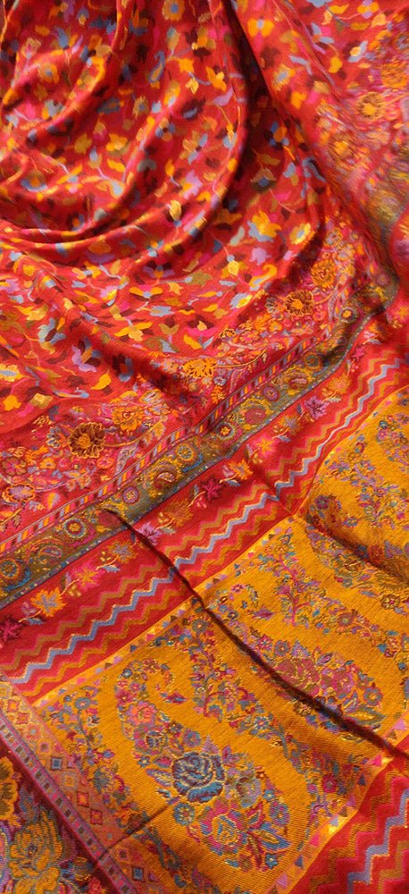 From our exclusive collection of Kashmiri Craftsmen, this is a Kashmiri Saree with Blouse which you would love to have it in your wardrobe. This Saree is a perfect occasion wear. Its an exclusive saree embroidered and a fresh collection directly from weavers in Kashmir.