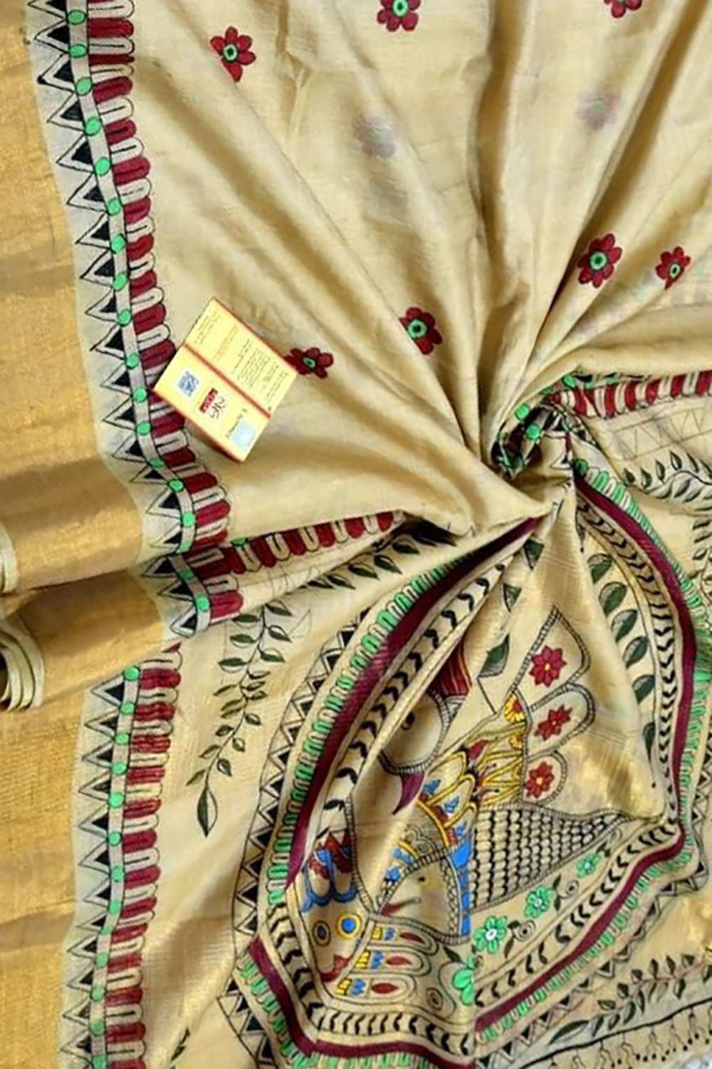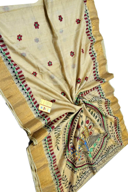 Pastel Hand Painted Madhubani Tussar Silk Saree