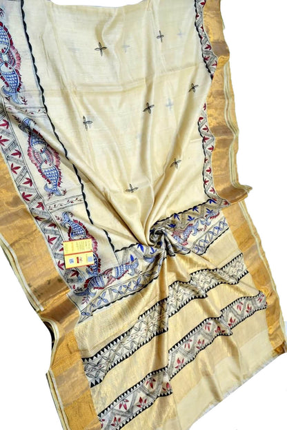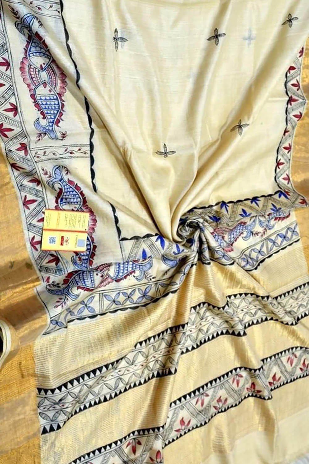 Pastel Hand Painted Madhubani Tussar Silk Saree