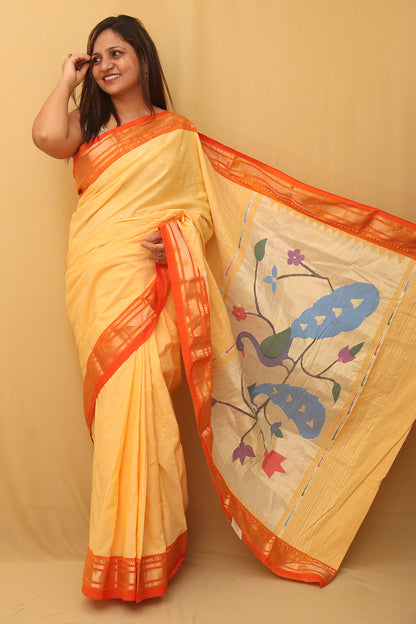 This is a Paithani Cotton Saree, which you would love to have it in your wardrobe. This Saree is a perfect occasion wear. This saree is the result of a painstakingly complex process of weaving & dyeing.