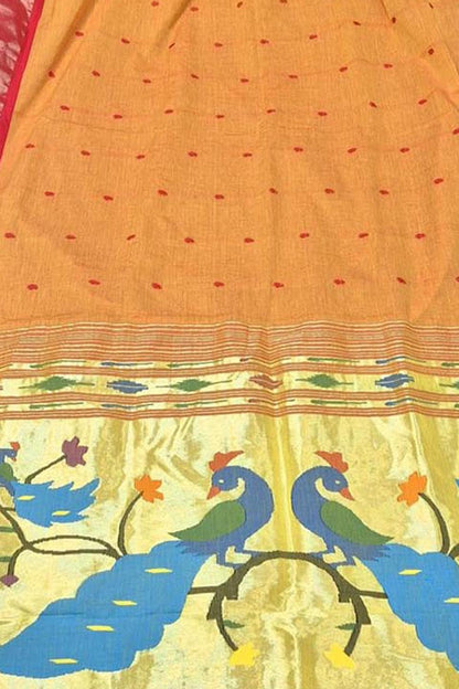 The Orange Paithani Handloom Cotton Saree is a stunning piece of traditional Indian attire that exudes elegance and grace. Made from high-quality handloom cotton, this saree features intricate Paithani weaving in a vibrant orange hue that is sure to make a statement. The lightweight fabric drapes beautifully, making it perfect for any occasion. The saree comes with a matching blouse piece, adding to its versatility. Its special features include: