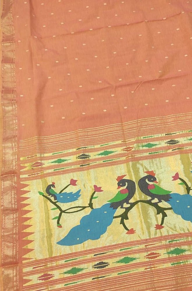 This is a Paithani Cotton Saree, which you would love to have it in your wardrobe. This Saree is a perfect occasion wear. This saree is the result of a painstakingly complex process of weaving & dyeing.