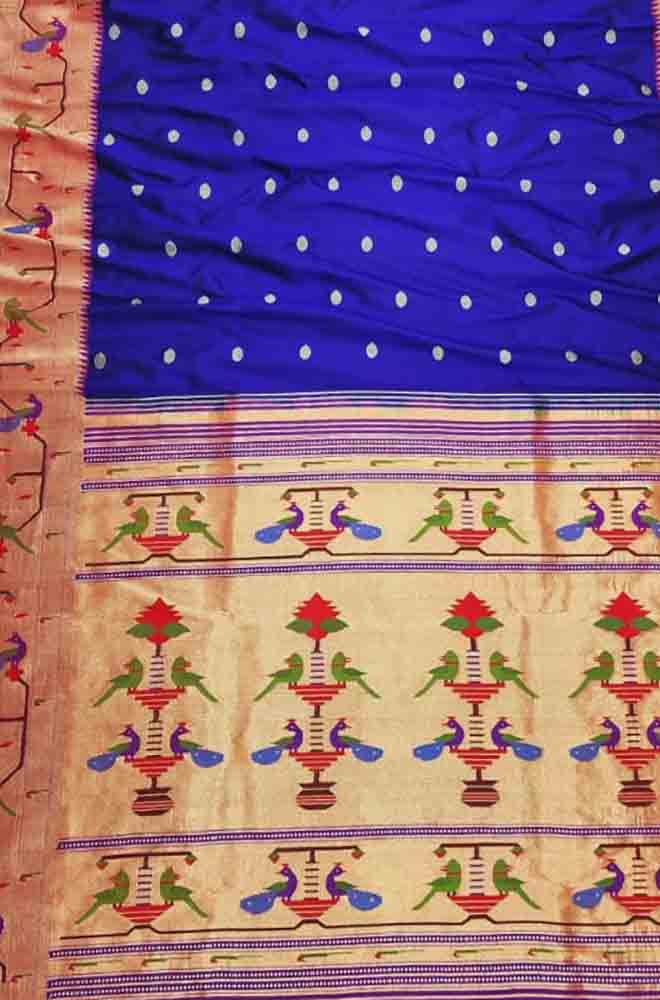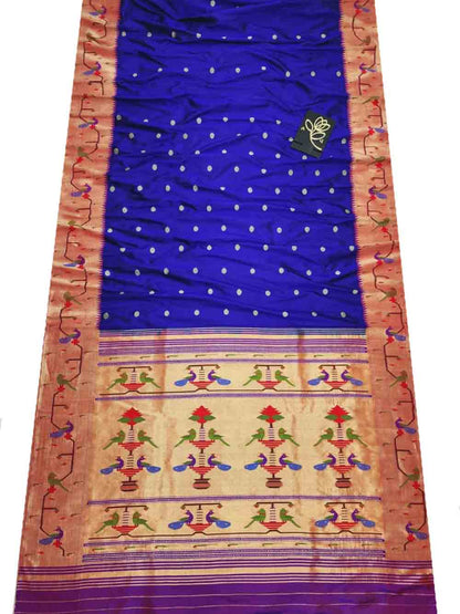 Blue Handloom Paithani Pure Silk Triple Muniya Border Peacock Design Saree