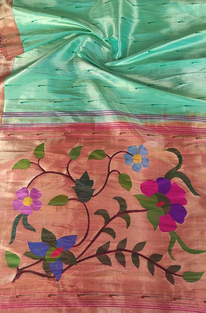 Green Handloom Paithani Pure Silk Muniya Border Floral Design Saree