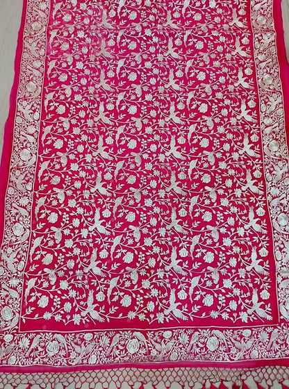 Parsi Embroidery is an aesthetic composition of pictorial traditions and an emblem of elegance. Combining the beauty inherent in four cultural traditions – Persian, Chinese, Indian and European – this exquisite textile form is truly an intercultural craft. .The Parsi Sarees are indeed worth a treasure. Parsi embroidery incorporates motifs that have deep meanings. The reverence of the Parsis towards nature is evident in their embroidery work. This is a Machine work Parsi Embroidered Saree
