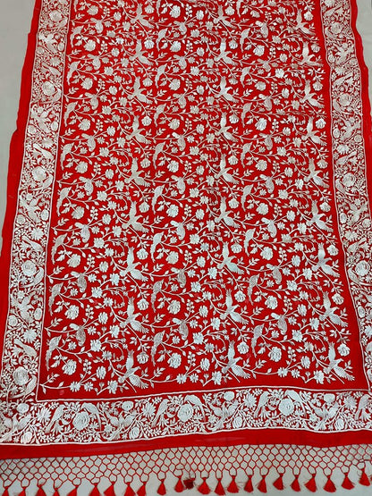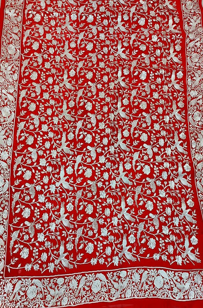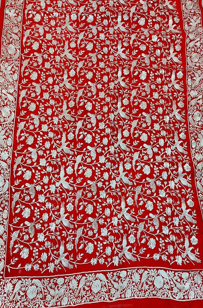 Parsi Embroidery is an aesthetic composition of pictorial traditions and an emblem of elegance. Combining the beauty inherent in four cultural traditions – Persian, Chinese, Indian and European – this exquisite textile form is truly an intercultural craft. .The Parsi Sarees are indeed worth a treasure. Parsi embroidery incorporates motifs that have deep meanings. The reverence of the Parsis towards nature is evident in their embroidery work. This is a Machine work Parsi Embroidered Saree