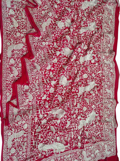 Parsi Embroidery is an aesthetic composition of pictorial traditions and an emblem of elegance. Combining the beauty inherent in four cultural traditions – Persian, Chinese, Indian and European – this exquisite textile form is truly an intercultural craft.The Parsi Sarees are indeed worth a treasure. Parsi embroidery incorporates motifs that have deep meanings. The reverence of the Parsis towards nature is evident in their embroidery work. This is a Machine work Parsi Embroidered Saree.