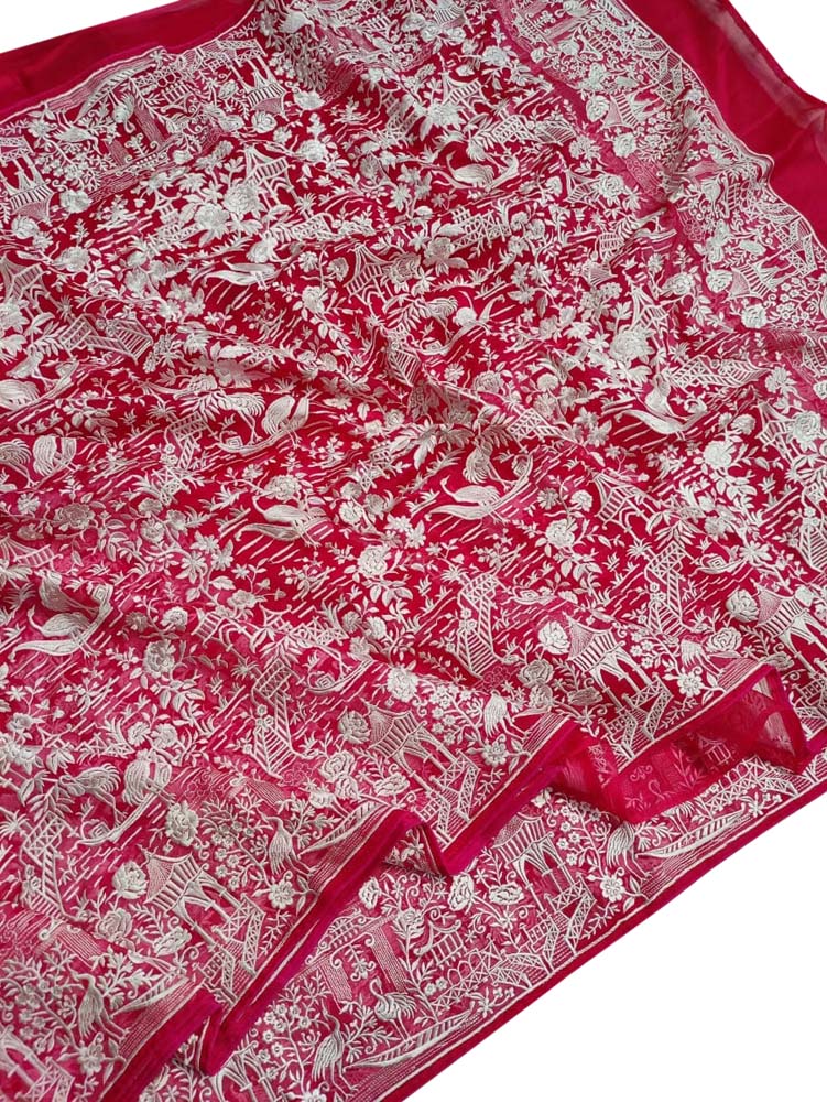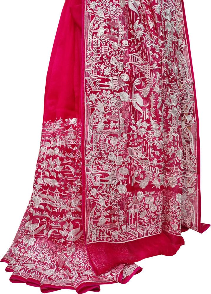 Parsi Embroidery is an aesthetic composition of pictorial traditions and an emblem of elegance. Combining the beauty inherent in four cultural traditions – Persian, Chinese, Indian and European – this exquisite textile form is truly an intercultural craft. .The Parsi Sarees are indeed worth a treasure. Parsi embroidery incorporates motifs that have deep meanings. The reverence of the Parsis towards nature is evident in their embroidery work. This is a Machine work Parsi Embroidered Saree