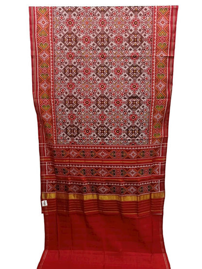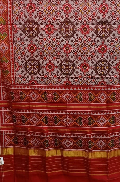 This Handloom Semi Patan Patola Saree is a single ikat Saree. It is mentioned as semi patan because the fabric and the design is same as patan patolas( which are double ikat weaved) but the weaving is single ikat. Single Ikat fabrics are created by the resist tie-dye method, with thread inter weaving of warp (lengthwise lay of thread) with plain weft (breadth wise thread weaving), or resisted weft yarns interspersed with plain weft. Patola means Queen of Silks.