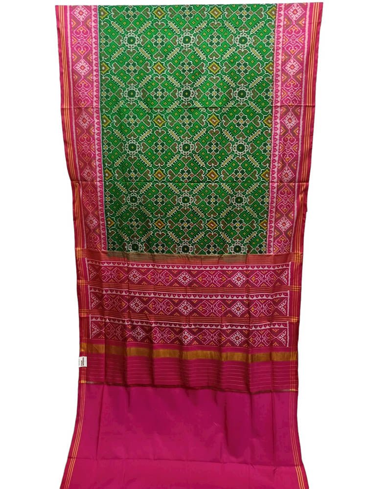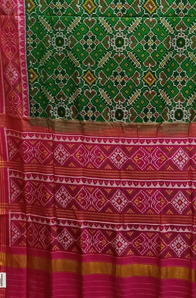This Handloom Semi Patan Patola Saree is a single ikat Saree. It is mentioned as semi patan because the fabric and the design is same as patan patolas( which are double ikat weaved) but the weaving is single ikat. Single Ikat fabrics are created by the resist tie-dye method, with thread inter weaving of warp (lengthwise lay of thread) with plain weft (breadth wise thread weaving), or resisted weft yarns interspersed with plain weft. Patola means Queen of Silks.