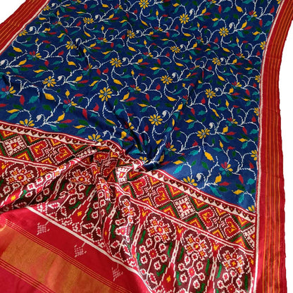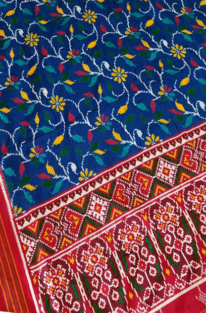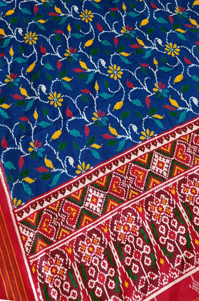 "The making of Patan Patola sarees is extremely laborious and requires anywhere between five months to one year to create a single saree. Four to five family members work in unison, delicately weaving the unique creation. Another feature of these hand-dyed patolas which makes them stand out is that the feel and look of the fabric is exactly the same from both sides. This is due to the use of horizontal double-resist technique of dyeing in the process of colouring the fabric. The use of natural dyes makes it very eco-friendly, garnering even more applause for the technique. This Saree Does not Come with Blouse Piece.