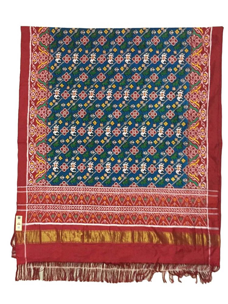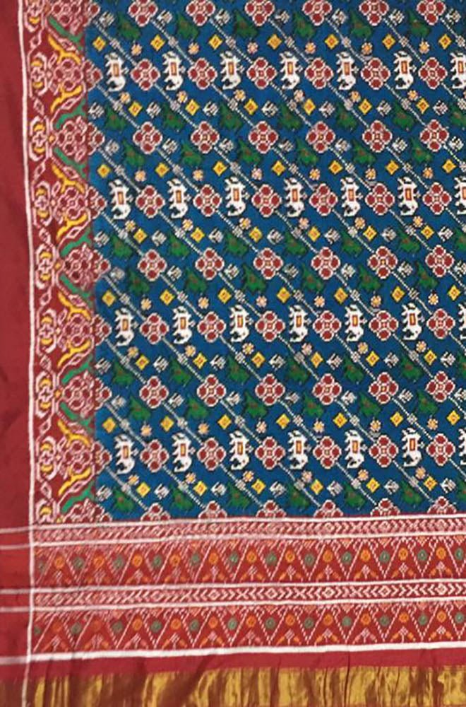 The making of Patan Patola sarees is extremely laborious and requires anywhere between five months to one year to create a single saree. Four to five family members work in unison, delicately weaving the unique creation. Another feature of these hand-dyed patolas which makes them stand out is that the feel and look of the fabric is exactly the same from both sides. This is due to the use of horizontal double-resist technique of dyeing in the process of colouring the fabric. The use of natural dyes makes it very eco-friendly, garnering even more applause for the technique. This Saree Does not Come with Blouse Piece.