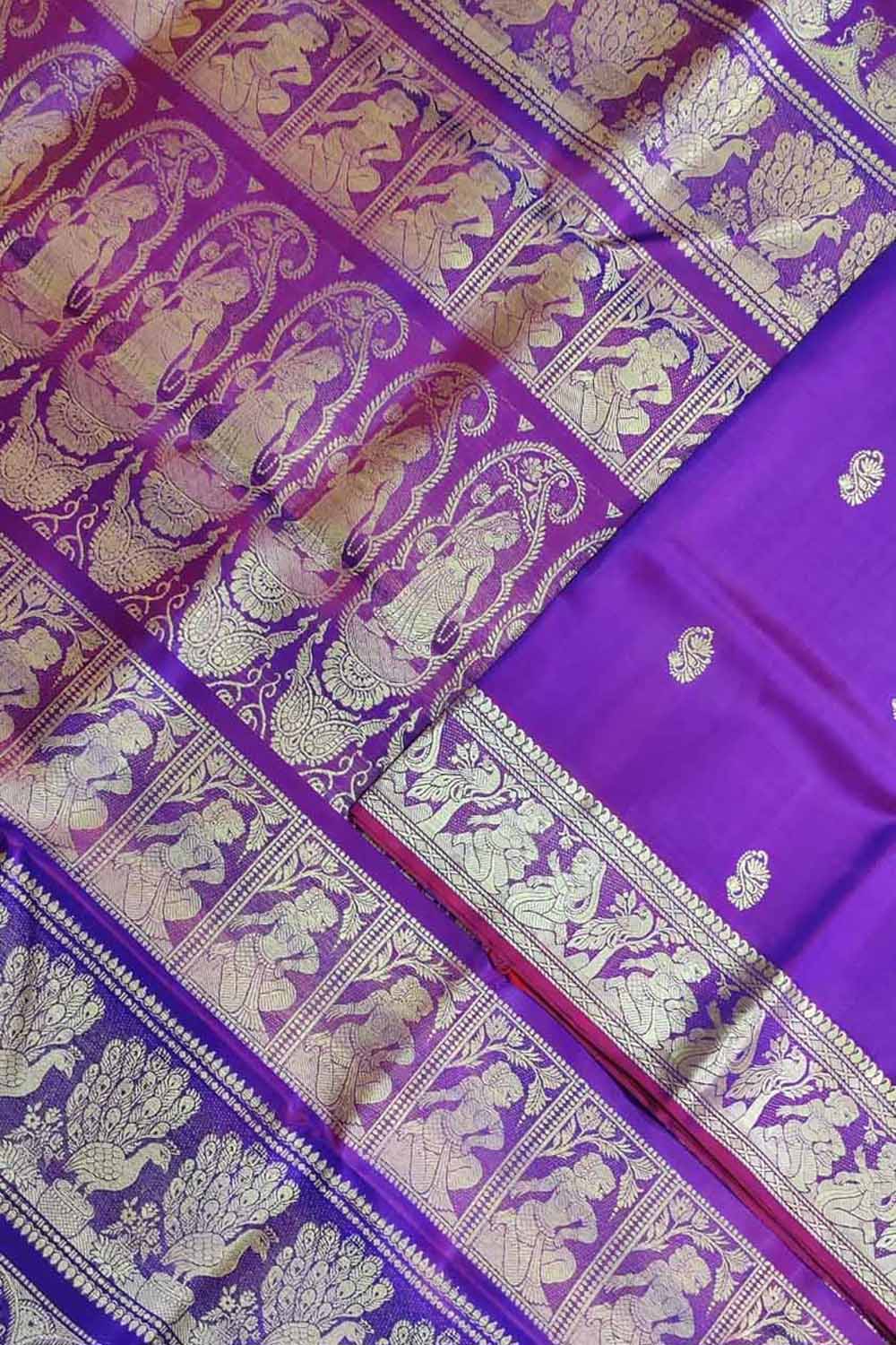 The Purple Baluchari Handloom Pure Silk Saree is a stunning piece of traditional Indian attire that is perfect for any special occasion. This saree is made from pure silk and is handloomed, ensuring that it is of the highest quality. The rich purple color of the saree is complemented by intricate gold and silver zari work, which adds a touch of elegance and sophistication to the overall design.