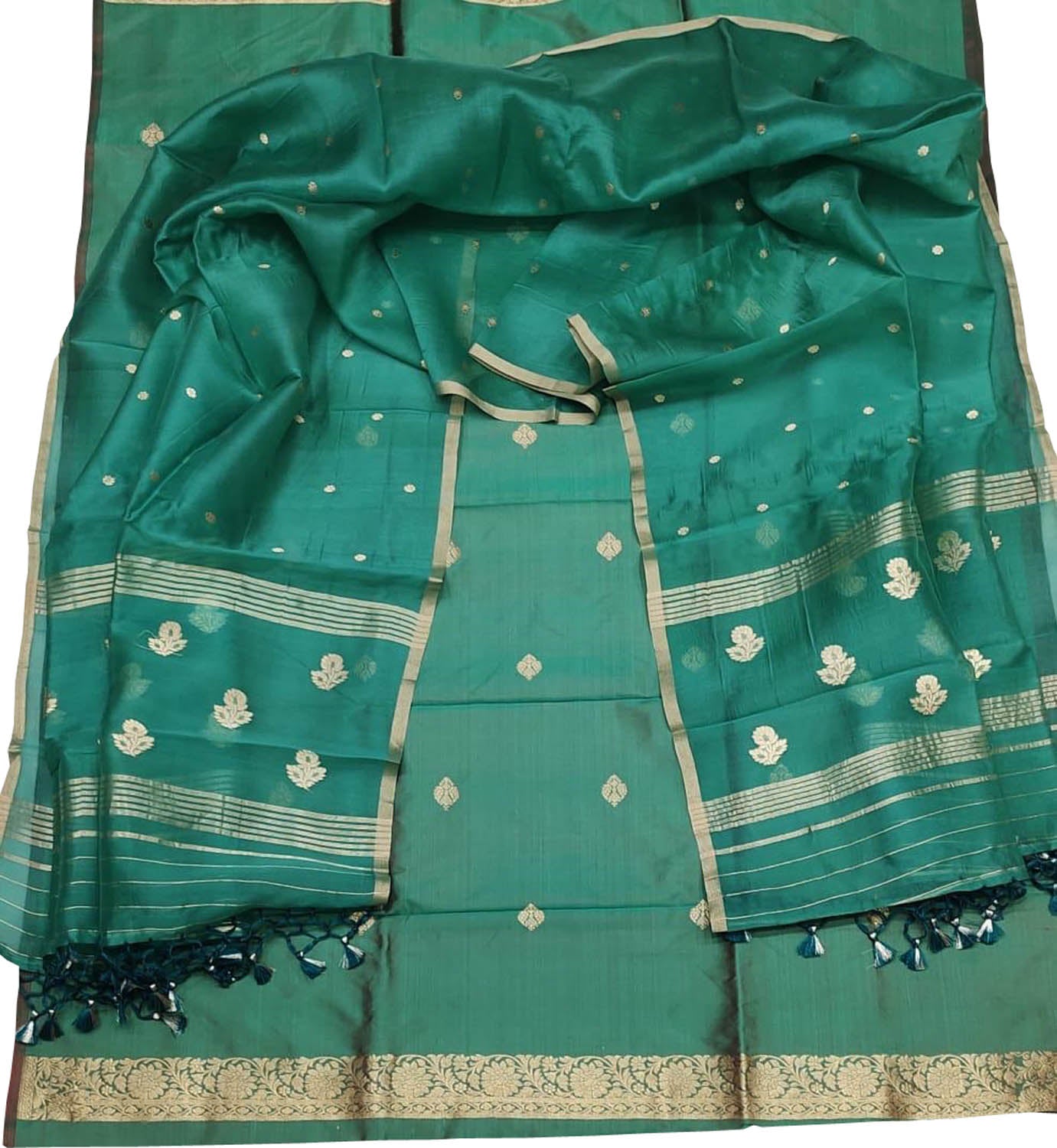 Elegance and sophistication come together in this exquisite Green Banarasi Pure Katan Silk Kadwa Handloom Three Piece Unstitched Suit with Kora Dupatta. Handcrafted with intricate kadwa weaving, this suit exudes timeless charm and grace. The rich green color adds a touch of regality, perfect for any special occasion. The pure silk fabric ensures a luxurious feel and a flattering drape. The set includes a kurta, salwar, and dupatta, all adorned with traditional Banarasi motifs. The Kora Dupatta adds a touch of ethereal beauty to the ensemble. Stand out in style with this stunning handloom creation.