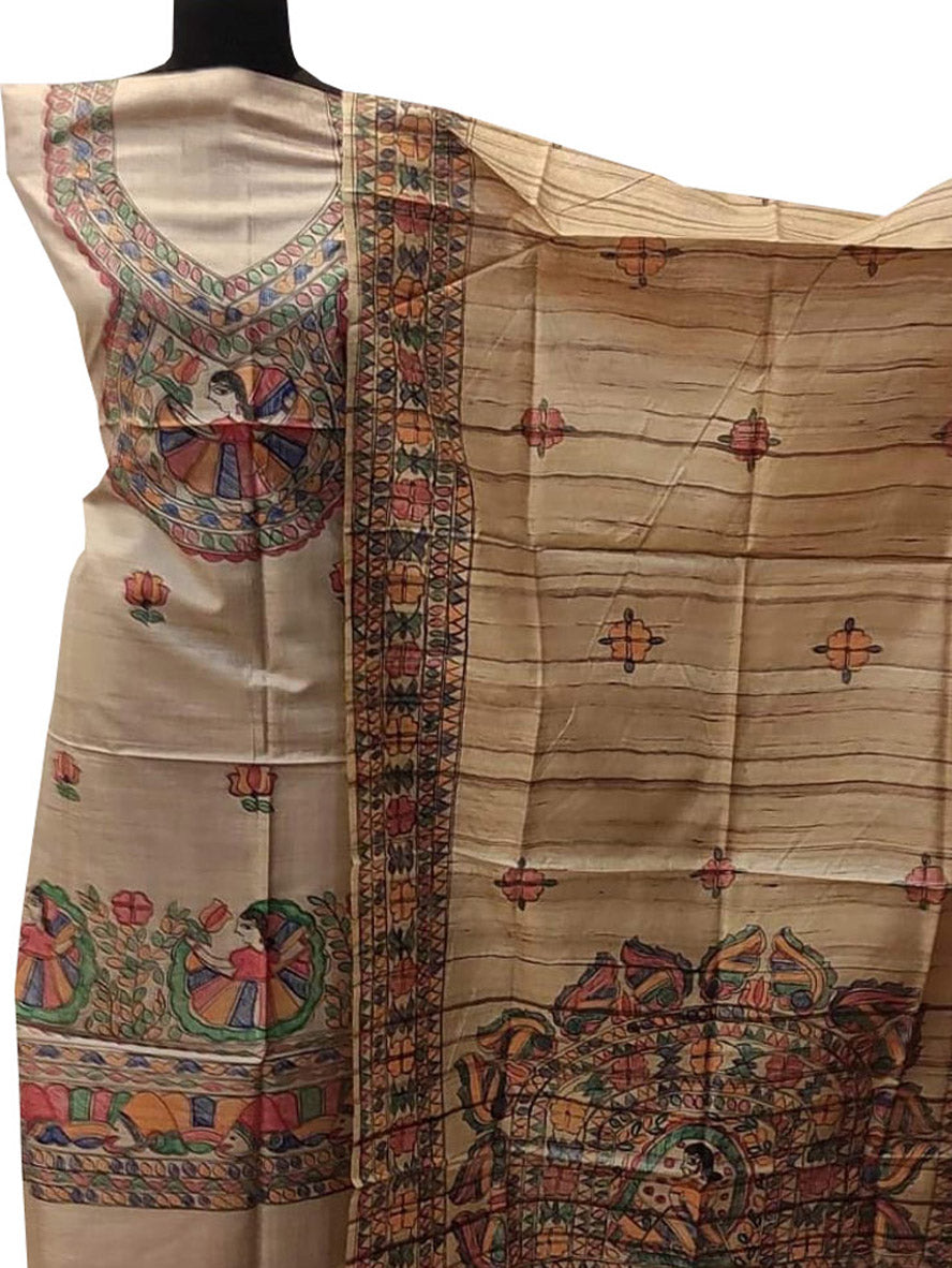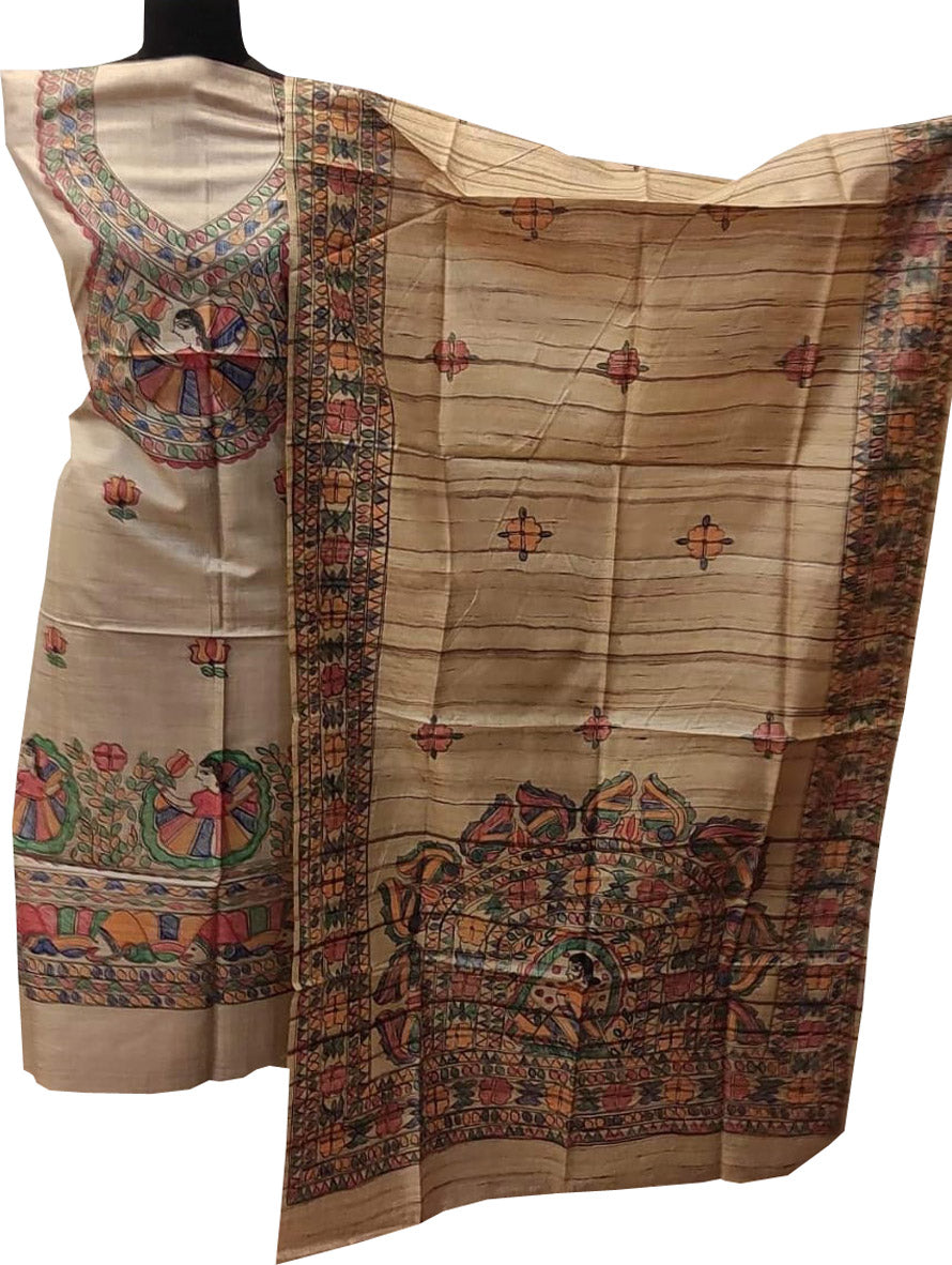 The Pastel Hand Painted Madhubani Pure Tussar Ghicha Unstitched Two Piece Suit Set is a beautiful and elegant choice for any occasion. The set includes a tussar ghicha kurta and dupatta, all of which are hand-painted with intricate Madhubani designs. The pastel colors used in the design give the suit a soft and feminine look, making it perfect for weddings, parties, or any formal event.