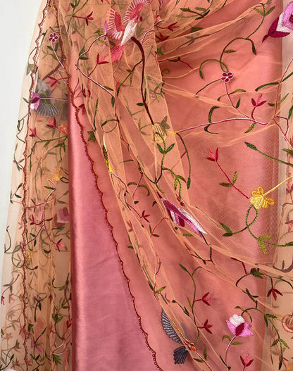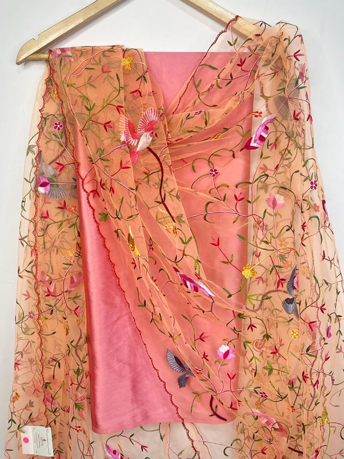 The Pure Silk Three Piece Unstitched Suit Set with Parsi Embroidered Convent Work Net Dupatta is a testament to exquisite craftsmanship and luxurious elegance. Crafted from pure silk, the unstitched suit ensemble offers creative freedom in tailoring to individual preferences. The highlight, a net dupatta adorned with Parsi Embroidered Convent Work, showcases intricate needlework depicting delicate motifs and patterns. This delicate artistry gracefully contrasts with the richness of silk, creating a harmonious blend of textures. The ensemble is a versatile canvas for customization, perfect for occasions demanding refined style, be it weddings, festivities, or cultural gatherings, emanating timeless charm and sophistication.
