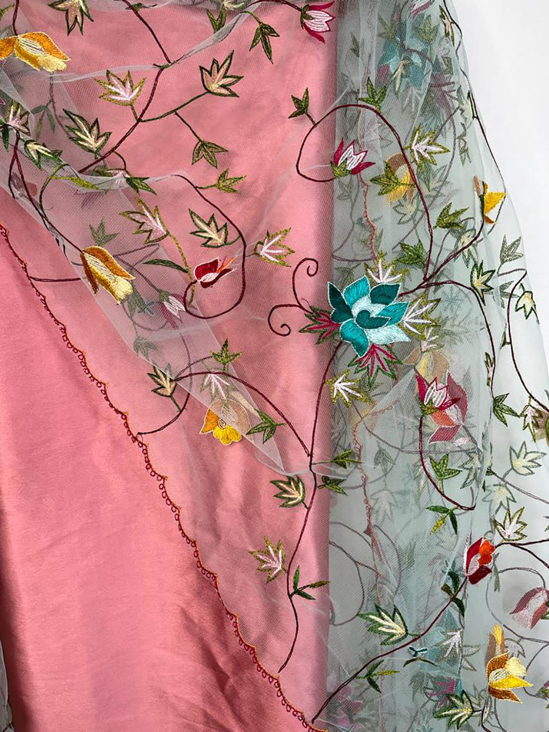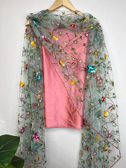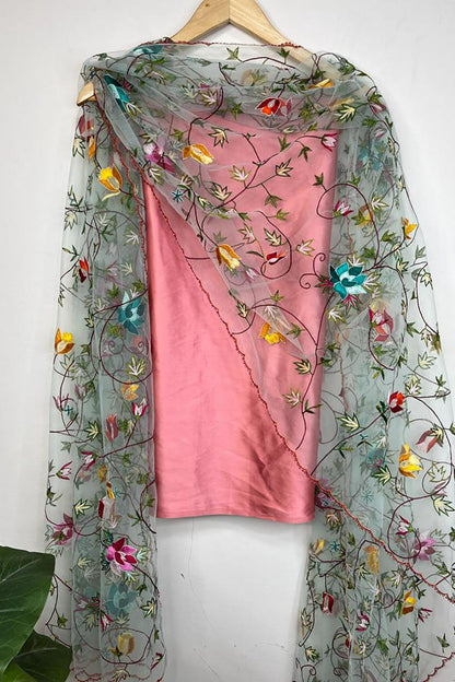 Pink Pure Silk Three Piece Unstitched Suit Set With Parsi Embroidered Convent Work Net Dupatta