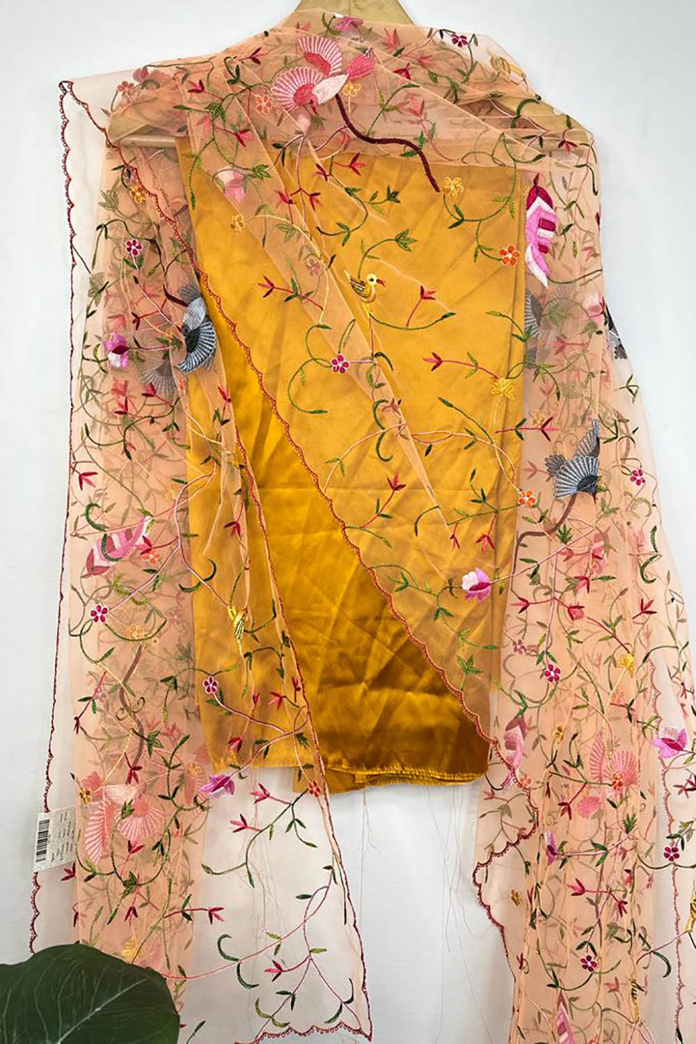 Yellow Pure Silk Three Piece Unstitched Suit Set With Parsi Embroidered Convent Work Net Dupatta