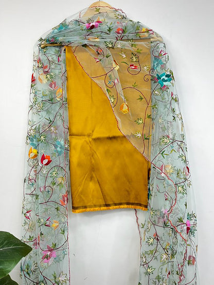 The Pure Silk Three Piece Unstitched Suit Set with Parsi Embroidered Convent Work Net Dupatta is a testament to exquisite craftsmanship and luxurious elegance. Crafted from pure silk, the unstitched suit ensemble offers creative freedom in tailoring to individual preferences. The highlight, a net dupatta adorned with Parsi Embroidered Convent Work, showcases intricate needlework depicting delicate motifs and patterns. This delicate artistry gracefully contrasts with the richness of silk, creating a harmonious blend of textures. The ensemble is a versatile canvas for customization, perfect for occasions demanding refined style, be it weddings, festivities, or cultural gatherings, emanating timeless charm and sophistication.