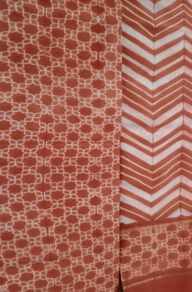 If you are looking for a classic Formal Wear Suit, you cant give a miss to our latest Shibori Cotton Silk Suit Set. Its an ideal wear for your office and a comfort Wear. It comes in 2 piece (we can get a bottom paired with it on request and will be charged extra for it). A lovely geomatric pattern on Kurti with a same color dupatta with a floral design looks very elegant. Shibori is a form of tie and dye in which the fabric is folded, pleated, tied or stitched in different ways to achieve various designs. "Accentuate your look by draping yourself in this Shibori Fabric .Shibori Fabric made with stunning patterns using Shibori-dye technique.