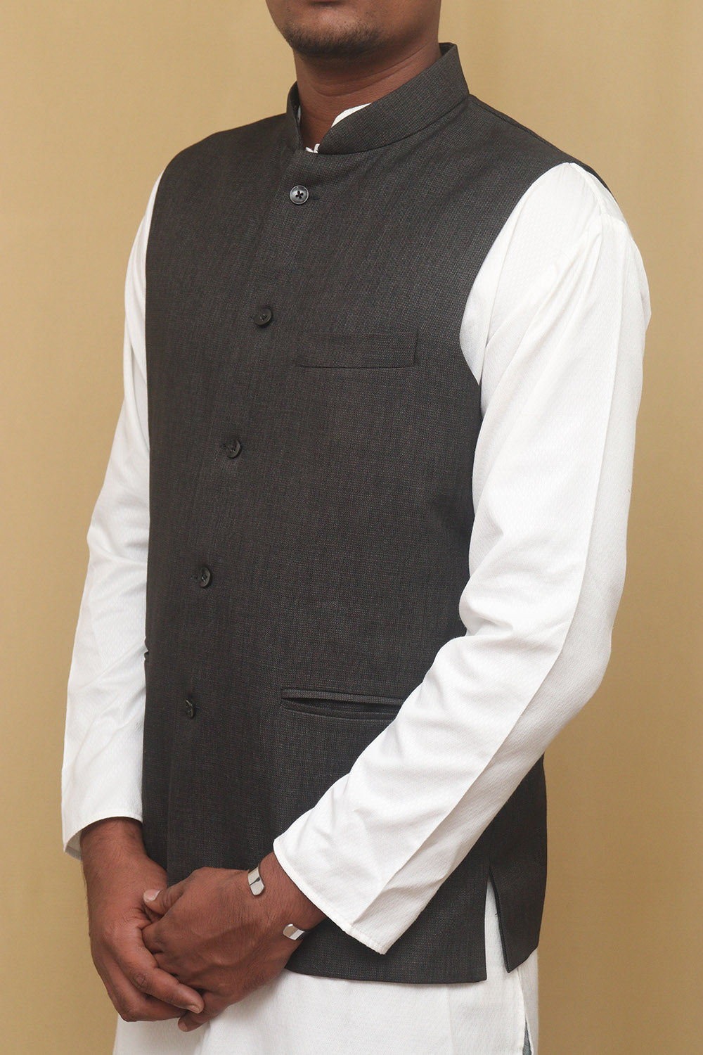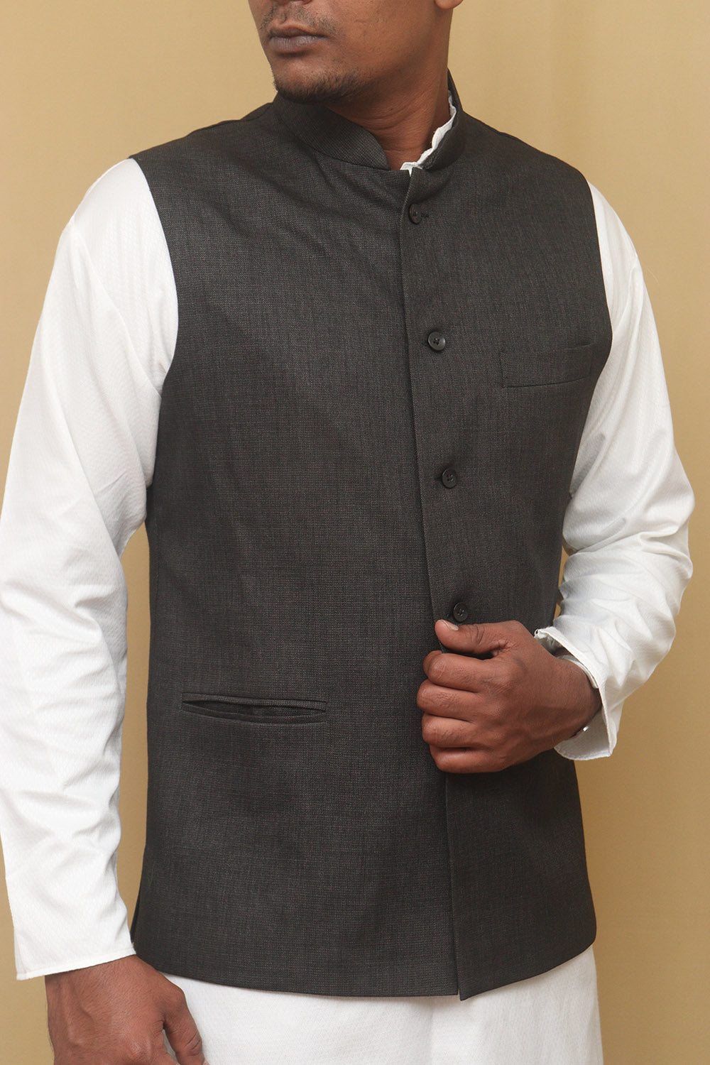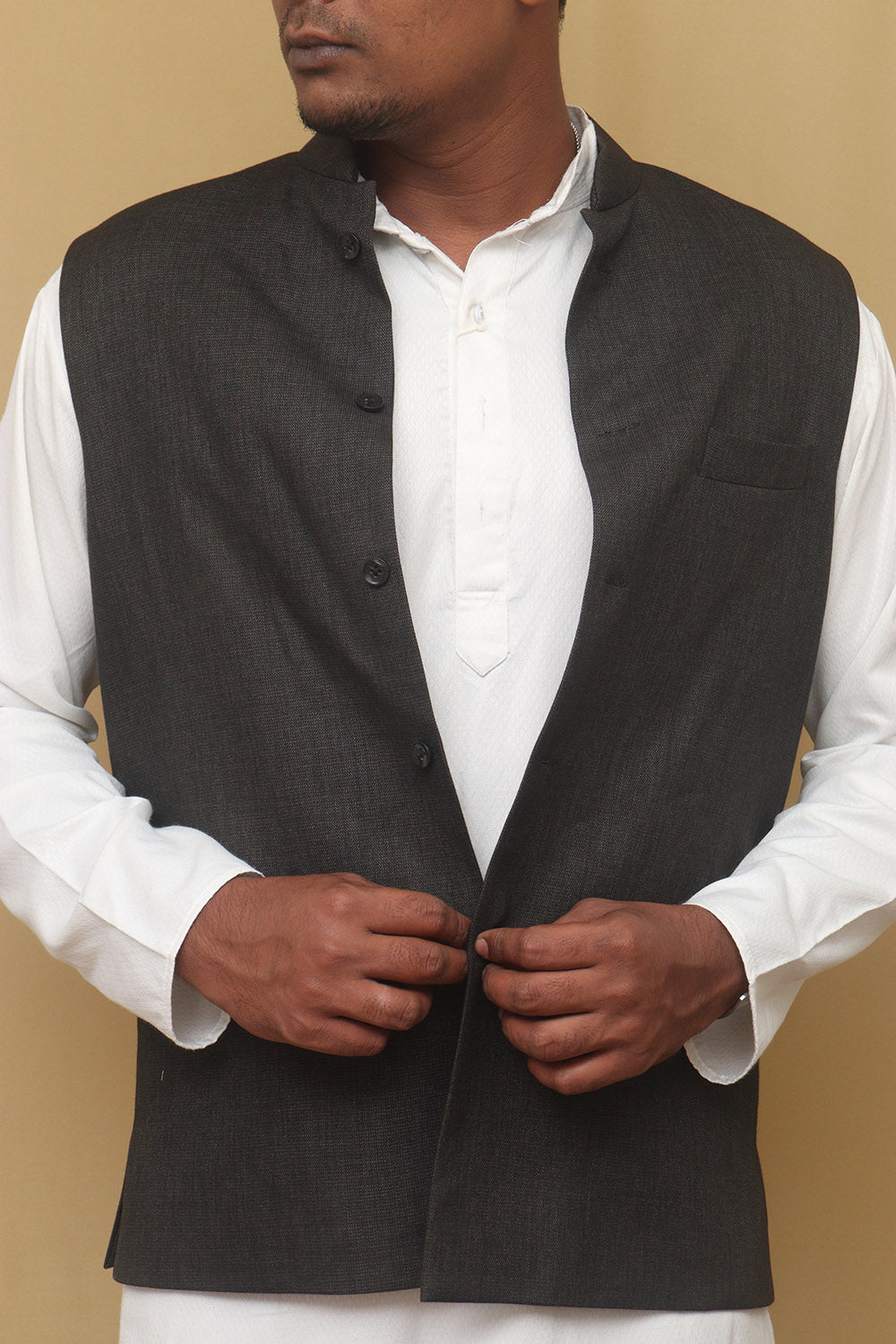 The Black Cotton Nehru Jacket is a timeless and versatile piece that adds a touch of sophistication to any outfit. Made from high-quality cotton, this jacket offers both comfort and durability. Its sleek black color makes it suitable for both formal and casual occasions. The jacket features a mandarin collar, giving it a unique and stylish look. It has a button-down front closure and two front pockets, providing functionality and convenience. The slim fit design enhances the wearer's silhouette, creating a polished and refined appearance. This jacket is perfect for layering over a shirt or a kurta, making it a must-have wardrobe staple for any fashion-conscious individual.