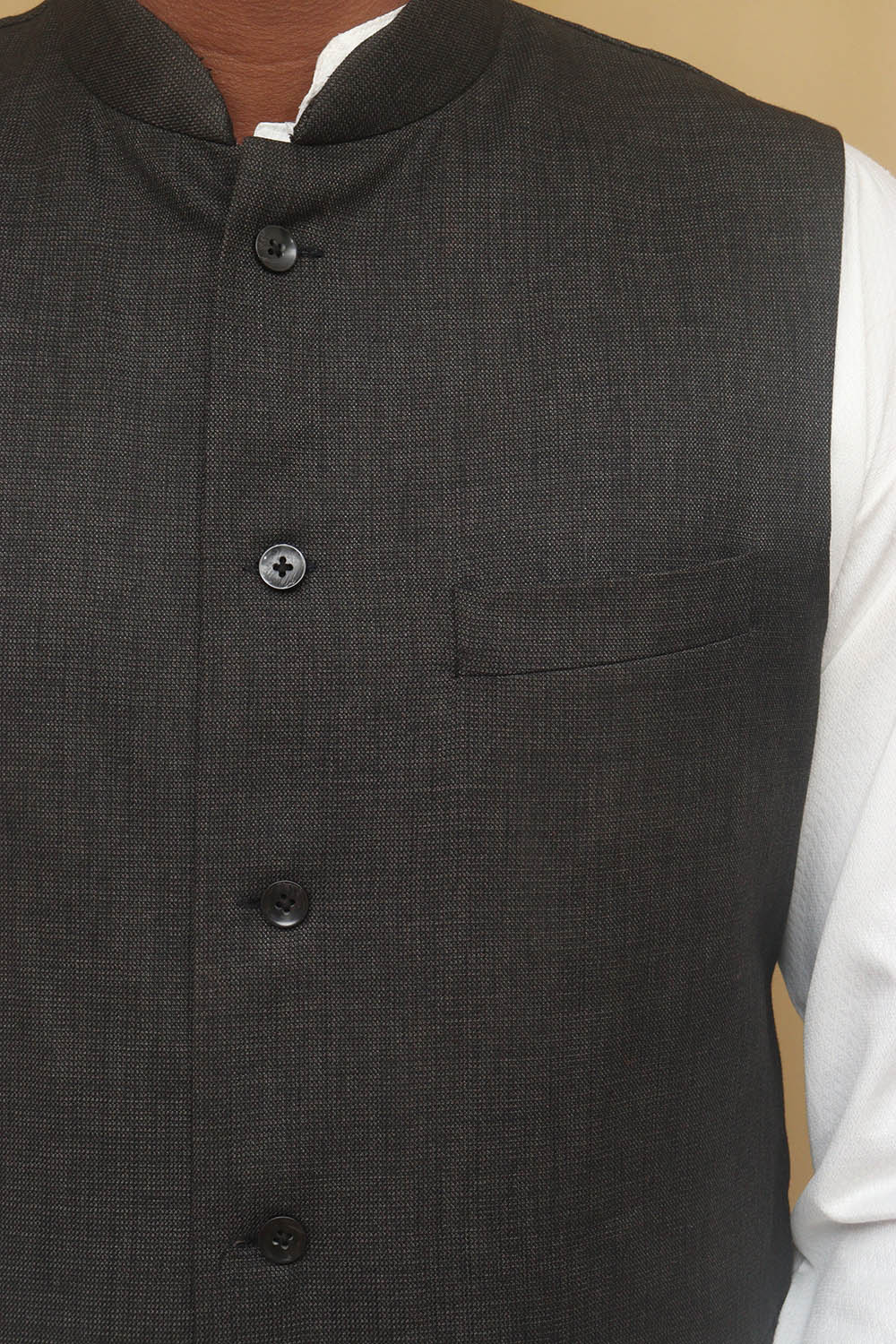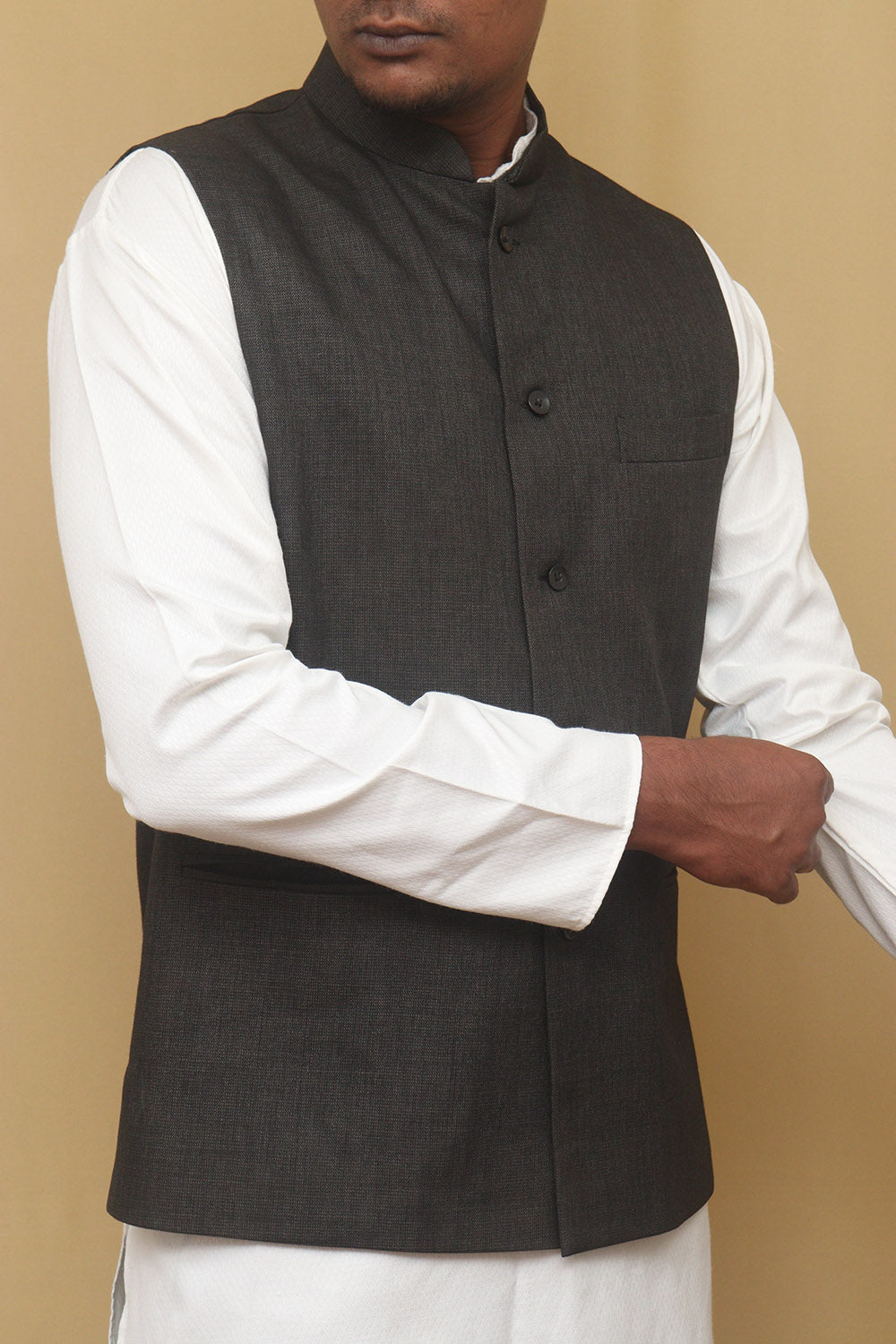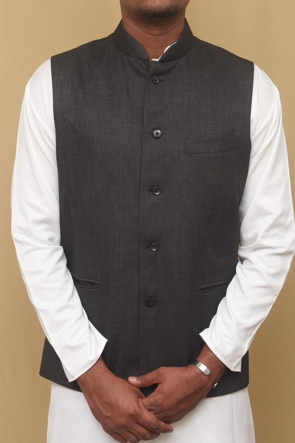 The Black Cotton Nehru Jacket is a timeless and versatile piece that adds a touch of sophistication to any outfit. Made from high-quality cotton, this jacket offers both comfort and durability. Its sleek black color makes it suitable for both formal and casual occasions. The jacket features a mandarin collar, giving it a unique and stylish look. It has a button-down front closure and two front pockets, providing functionality and convenience. The slim fit design enhances the wearer's silhouette, creating a polished and refined appearance. This jacket is perfect for layering over a shirt or a kurta, making it a must-have wardrobe staple for any fashion-conscious individual.