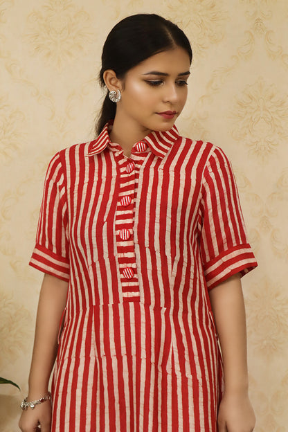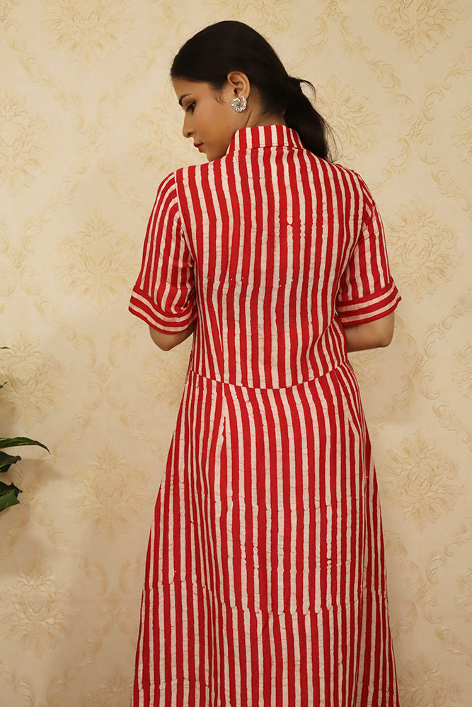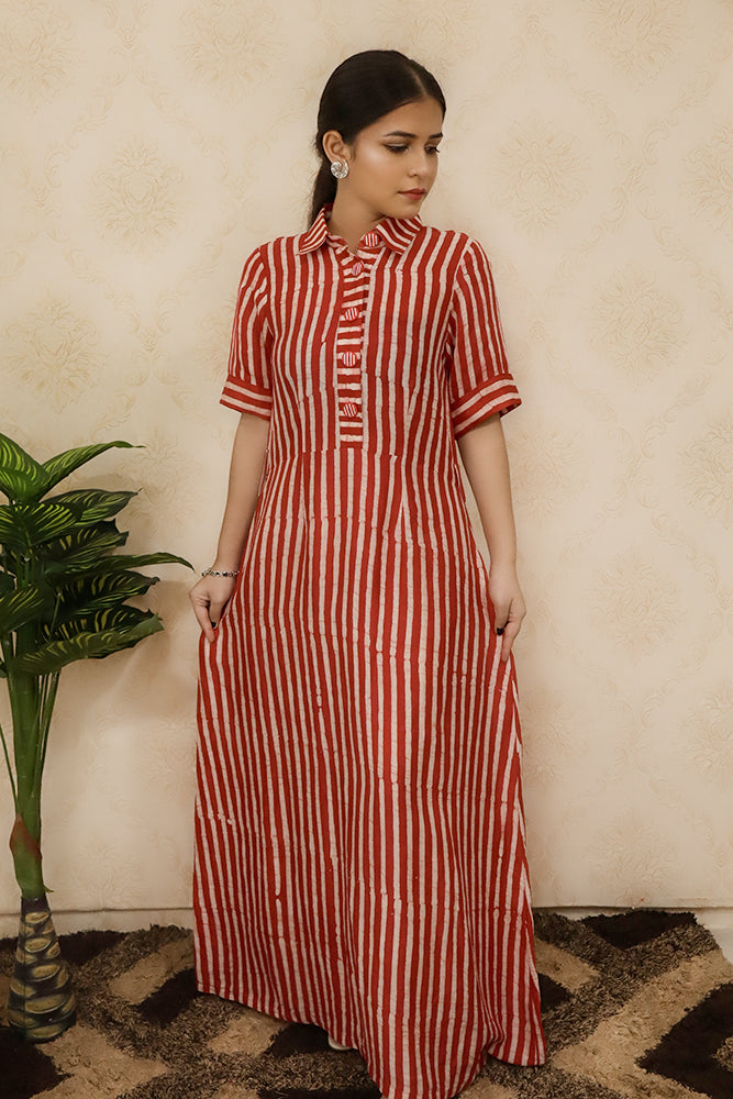 For an evening out with friends or a party with colleagues, what you need is something which is not too dressy but nevertheless chic and upscale. This red and white silk maxi dress is flamboyant with a subtle note of charm and beauty. The striped batik print is cheerful and unique while its collar neckline comes with placket and buttons. The sleeves are short while the dress is ankle length. Provided with a striped belt to clinch the waist, it heightens the horizon of the beauty of the dress. Wear it woman, and show the world you can’t resist the best!