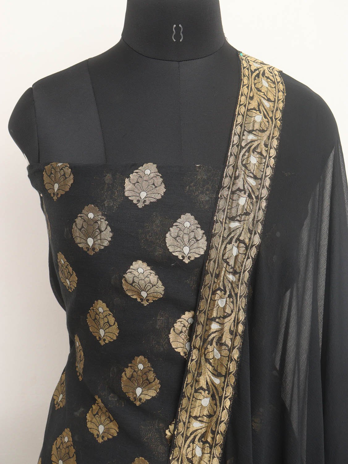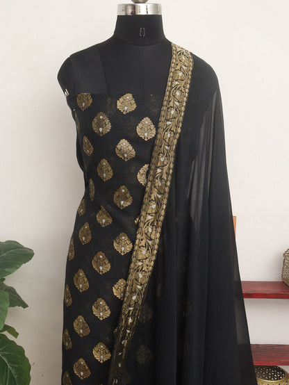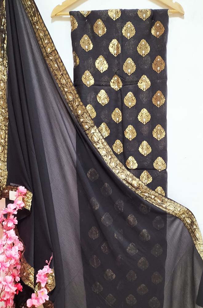 The Black Banarasi Georgette Sona Roopa Three Piece Unstitched Suit Set is a must-have for anyone looking to add a touch of elegance and sophistication to their wardrobe. Whether you're attending a wedding, a formal event, or a casual gathering, this suit set is sure to make you stand out from the crowd. So why wait? Order your Black Banarasi Georgette Sona Roopa Three Piece Unstitched Suit Set today and experience the beauty and elegance of this stunning piece of clothing.