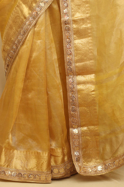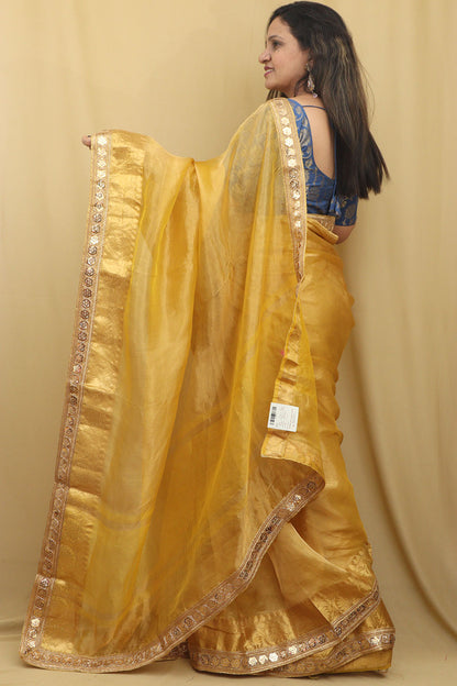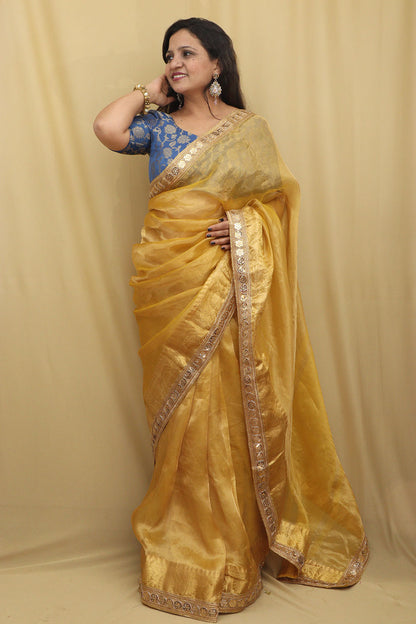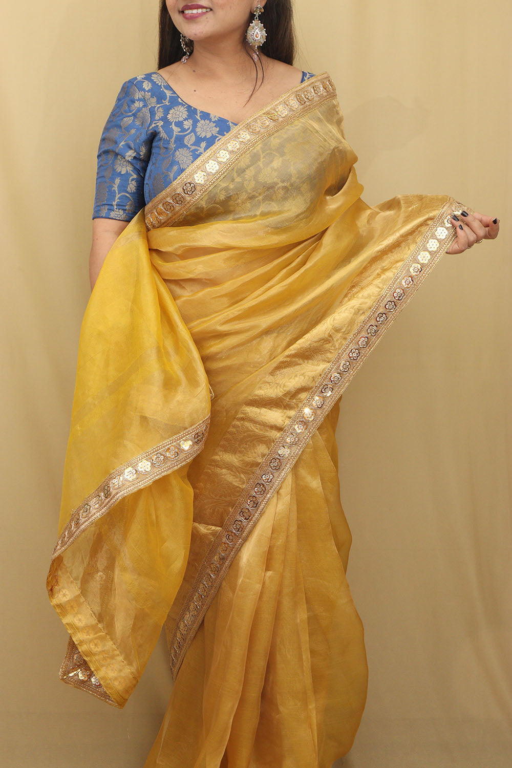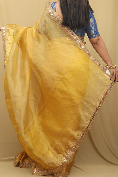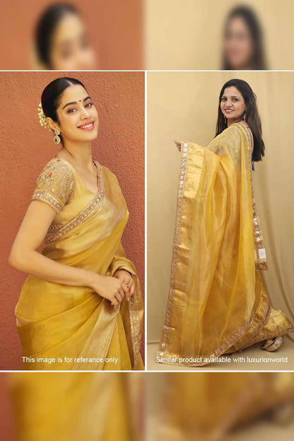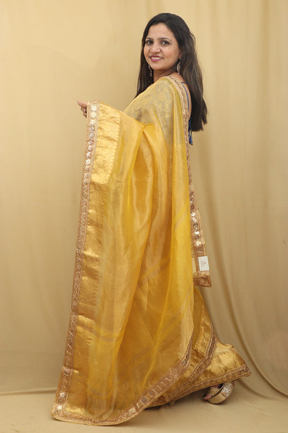 The Yellow Banarasi Tissue Saree is a stunning piece of traditional Indian attire that exudes elegance and grace. Made from luxurious Banarasi tissue fabric, this saree features intricate gold zari work and delicate floral motifs that add a touch of sophistication to any outfit. The bright yellow color of the saree is perfect for festive occasions and weddings, making it a must-have in every woman's wardrobe. The lightweight and breathable fabric make it comfortable to wear all day long, while the rich texture and sheen of the fabric give it a luxurious look.